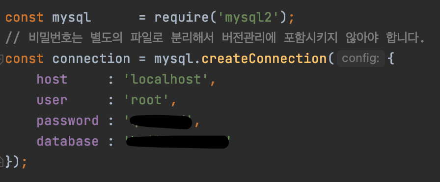 mysql2 가 설치 완료 되었으면 index.js에 데이터 베이스의 연결 정보를 입력한다.